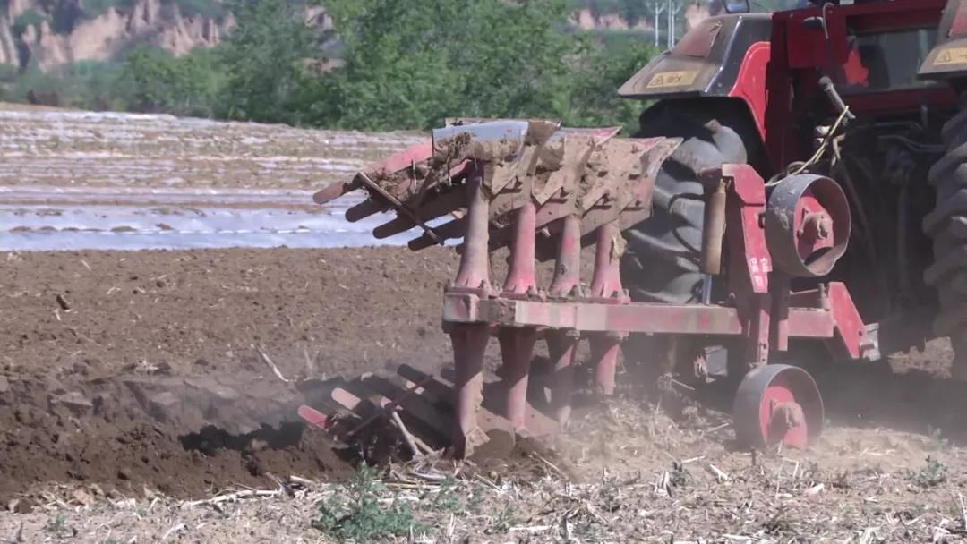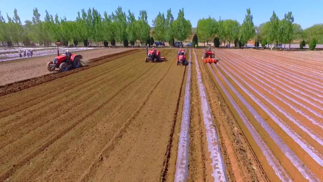 翻耕机、深松机、镀膜机在田地里来回穿梭。