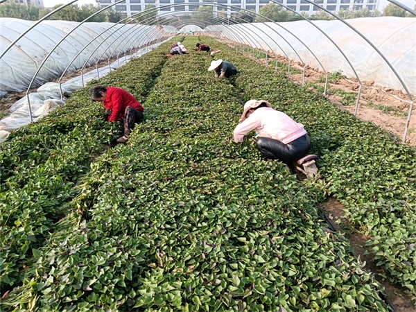 红薯芽苗又称红薯叶、地瓜叶,为旋花科甘薯属植物,是经人工选择而选育出供食用的红薯苗顶端茎尖嫩茎的品种,是绿色蔬菜产品。 沙河市金农农业专业合作社生产的脱毒红薯苗,人工拔草,生产绿色健康食品。